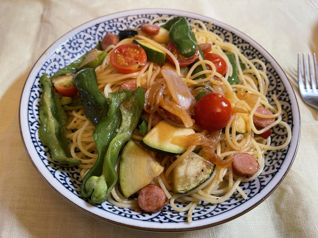 同じ畑で採れたズッキーニ、ピーマンとスーパーで買っておいた玉ねぎを使ってパスタに。