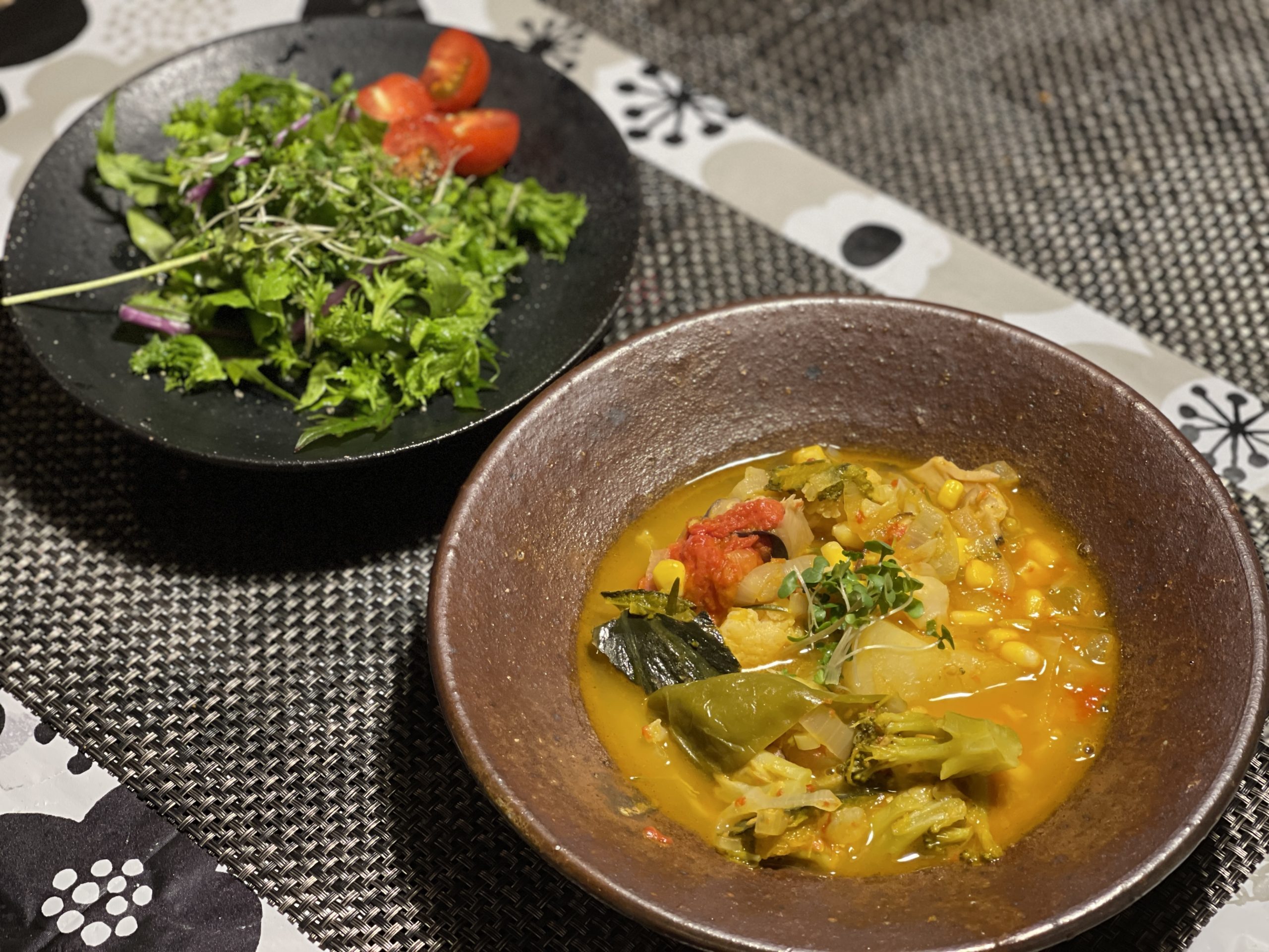 買い置きの葉物野菜とミニトマトでサラダ。