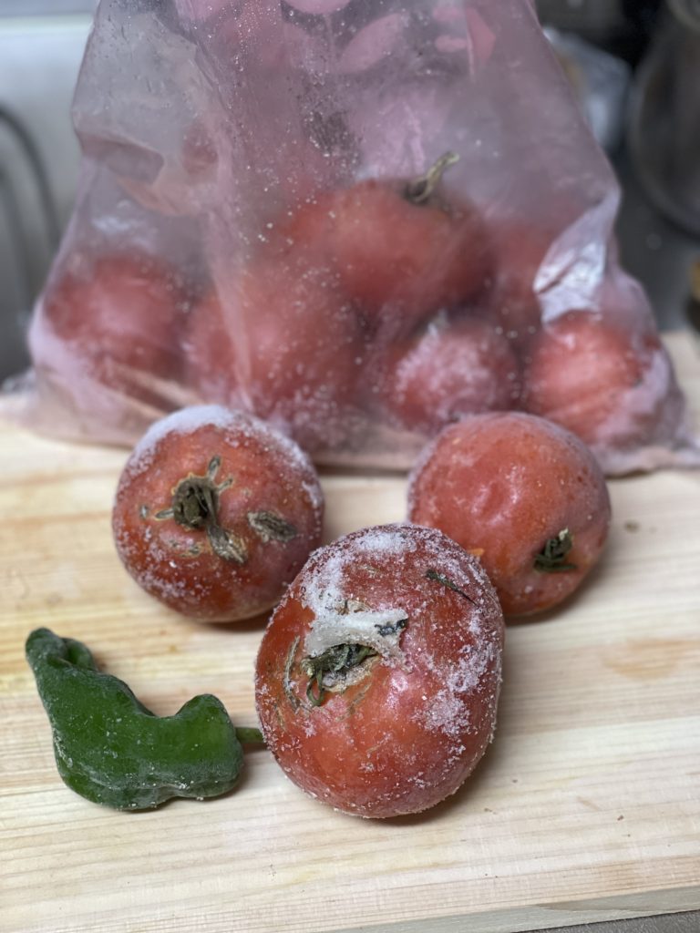 そして去年畑で採れて冷凍しておいたトマトとピーマンを使うことに。