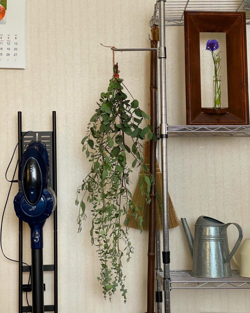 玄関横に去年植えたユーカリが2mを超えてきたので剪定。とってもいい香りなので部屋に吊るしてみました。