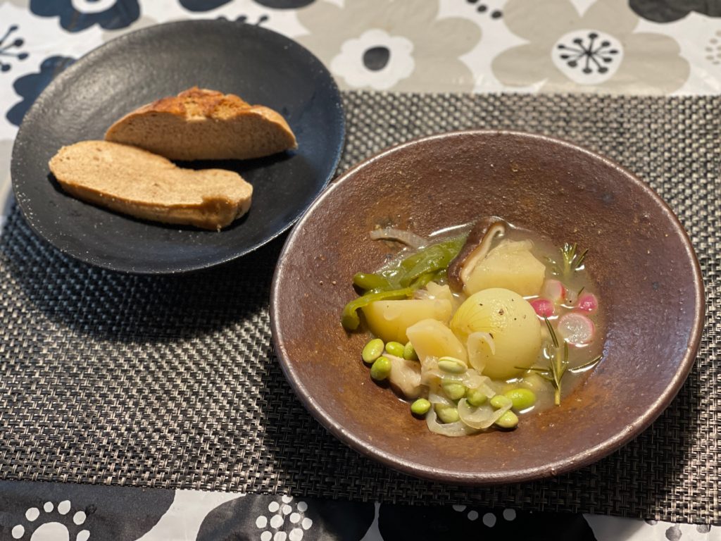 パンを焼いている間に、鍋に具材を突っ込んで無水調理。11時過ぎにようやく食事にありつきました。