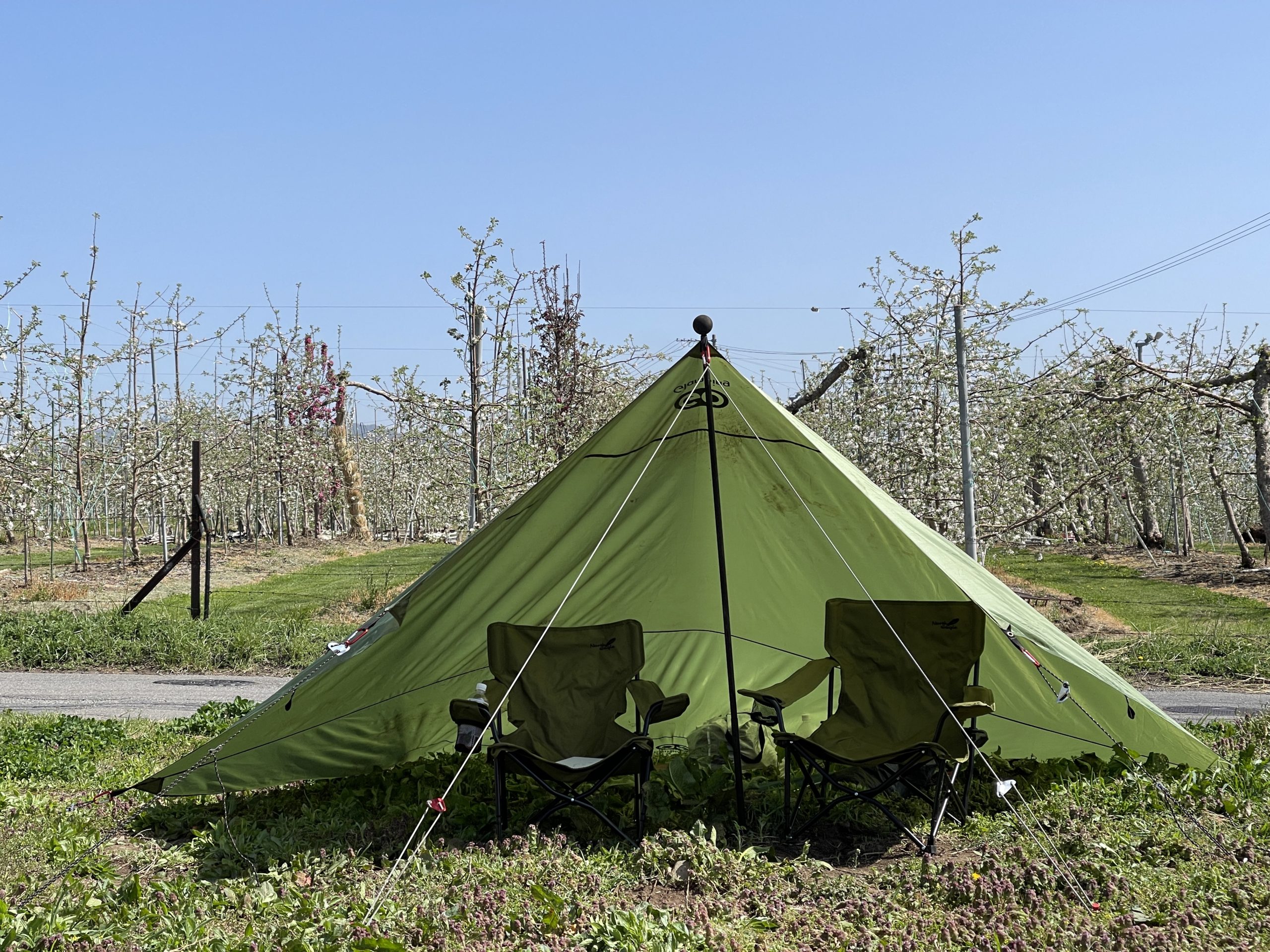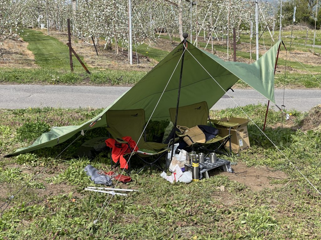お隣のリンゴ園の花が満開。花びらが桜に似てますが大きいですね。そろそろ受粉作業~農薬散布の時期。・・・ということで、今日は念のためタープをリンゴ園側に背を向ける形で、ヘキサタープを張ってみました。