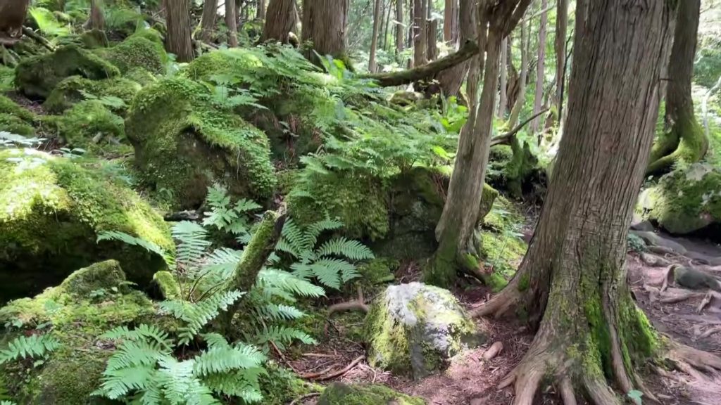 途中、北八ヶ岳のような、苔やシダが美しい森の幻想的な風景が広がります。