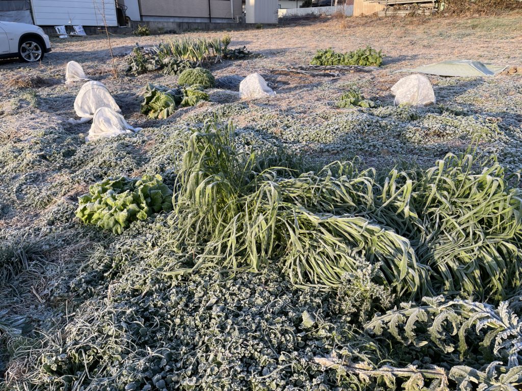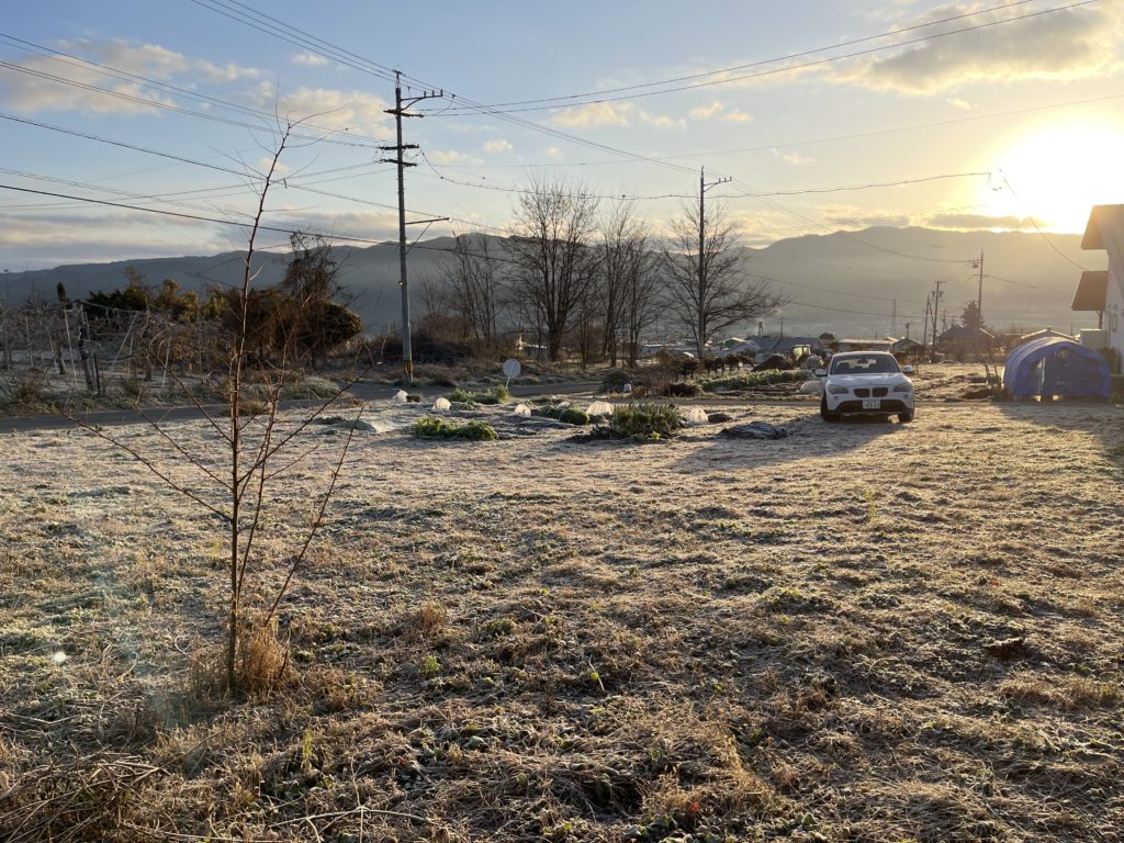 中央道で約1時間半。高速道路に乗る前に畑に寄ってみました。ちょうど山から陽が昇るころ。畑は霜で覆われていました。